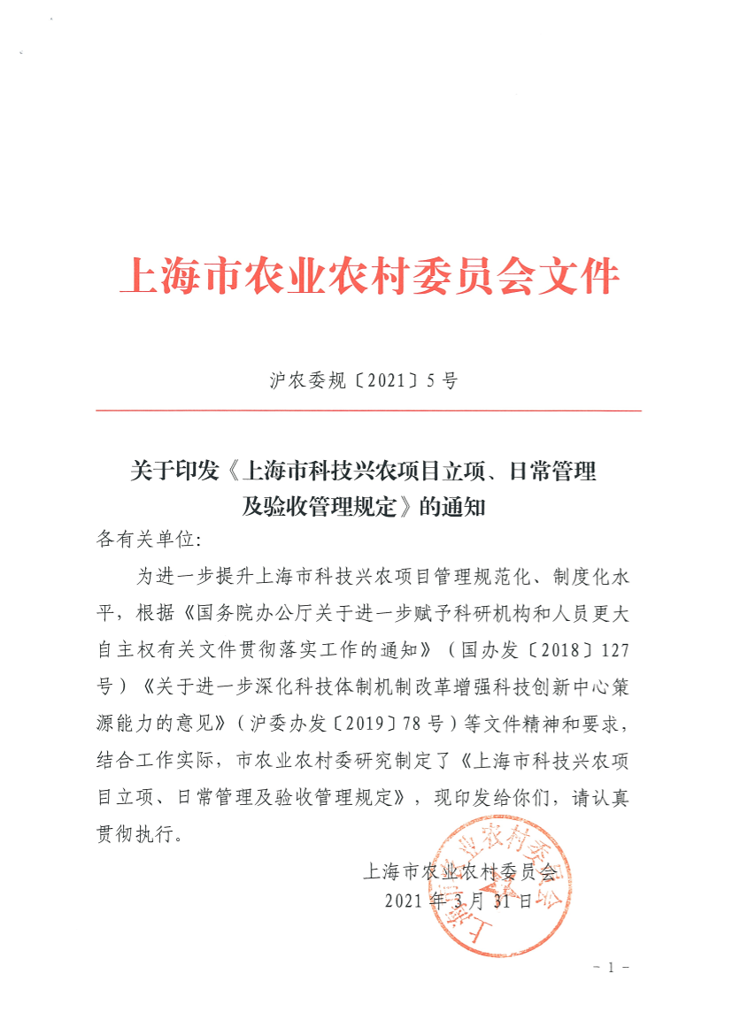 为进一步提升上海市科技兴农项目管理规范化、制度化水平,根据《国务院办公厅关于进一步赋予科研机构和人员更大自主权有关文件贯彻落实工作的通知》(国办发〔2018〕127号)《关于进一步深化科技体制机制改革增强科技创新中心策源能力的意见》(沪委办发〔2019〕78号)等文件精神和要求,结合工作实际,市农业农村委研究制定了《上海市科技兴农项目立项、日常管理及验收管理规定》,现印发给你们,请认真贯彻执行。