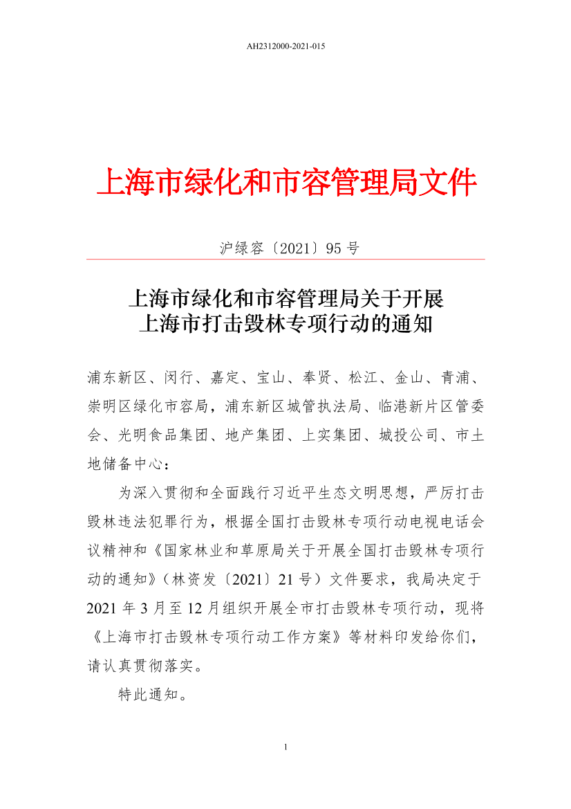 为深入贯彻和全面践行习近平生态文明思想,严厉打击毁林违法犯罪行为,根据全国打击毁林专项行动电视电话会议精神和《国家林业和草原局关于开展全国打击毁林专项行动的通知》(林资发〔2021〕21号)文件要求,我局决定于2021年3月至12月组织开展全市打击毁林专项行动,现将《上海市打击毁林专项行动工作方案》等材料印发给你们,请认真贯彻落实。
