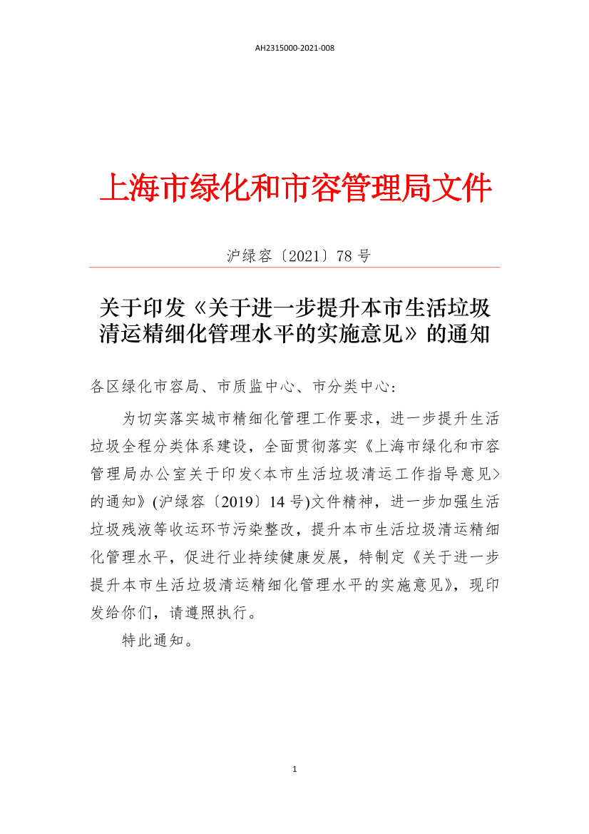 为切实落实城市精细化管理工作要求,进一步提升生活垃圾全程分类体系建设,全面贯彻落实《上海市绿化和市容管理局办公室关于印发<本市生活垃圾清运工作指导意见>的通知》(沪绿容〔2019〕14号)文件精神,进一步加强生活垃圾残液等收运环节污染整改,提升本市生活垃圾清运精细化管理水平,促进行业持续健康发展,特制定《关于进一步提升本市生活垃圾清运精细化管理水平的实施意见》,现印发给你们,请遵照执行。