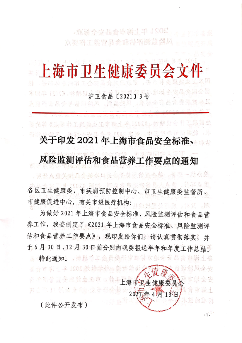 为做好2021年上海市食品安全标准、风险监测评估和食品营养工作,我委制定了《2021年上海市食品安全标准、风险监测评估和食品营养工作要点》。现印发给你们,请认真贯彻落实,并于6月30日、12月30日前分别向我委报送半年和年度工作总结。