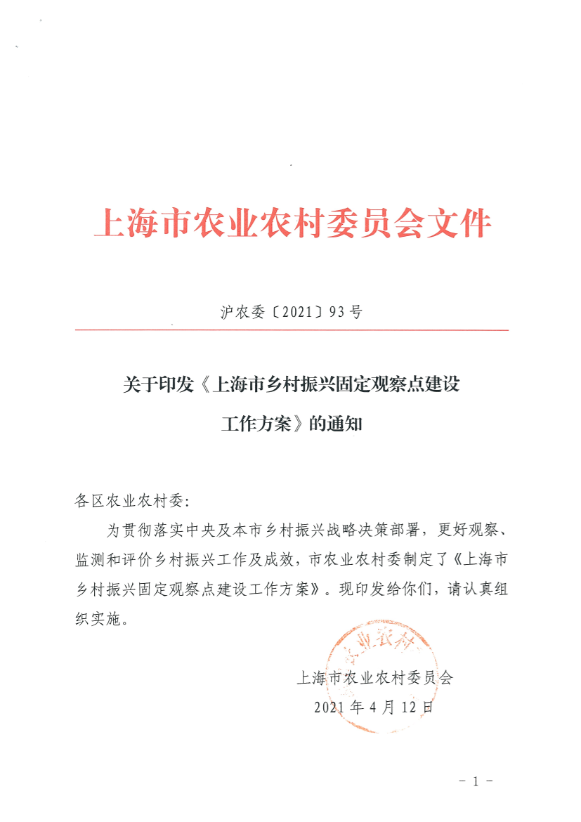 为贯彻落实中央及本市乡村振兴战略决策部署,更好观察、监测和评价乡村振兴工作及成效,市农业农村委制定了《上海市乡村振兴固定观察点建设工作方案》。现印发给你们,请认真组织实施。
