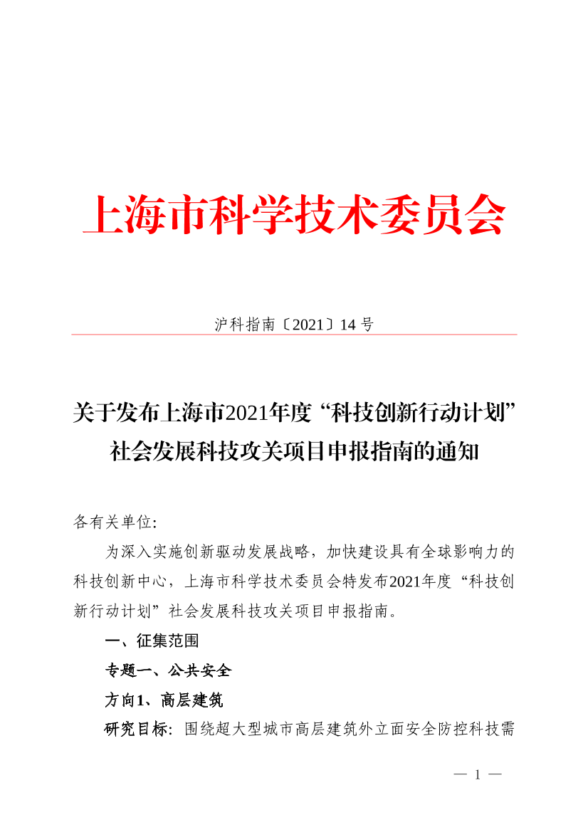 为深入实施创新驱动发展战略,加快建设具有全球影响力的科技创新中心,上海市科学技术委员会特发布2021年度“科技创新行动计划”社会发展科技攻关项目申报指南。