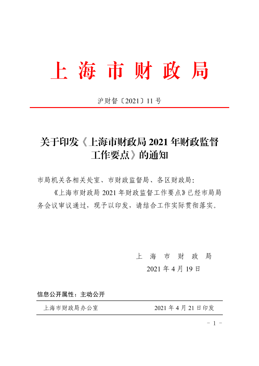 《上海市财政局2021年财政监督工作要点》已经市局局务会议审议通过,现予以印发,请结合工作实际贯彻落实。