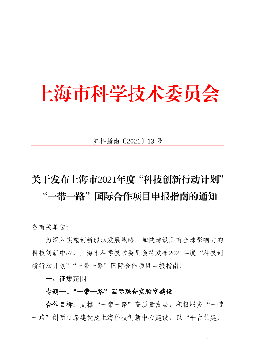 为深入实施创新驱动发展战略,加快建设具有全球影响力的科技创新中心,上海市科学技术委员会特发布2021年度“科技创新行动计划”“一带一路”国际合作项目申报指南。