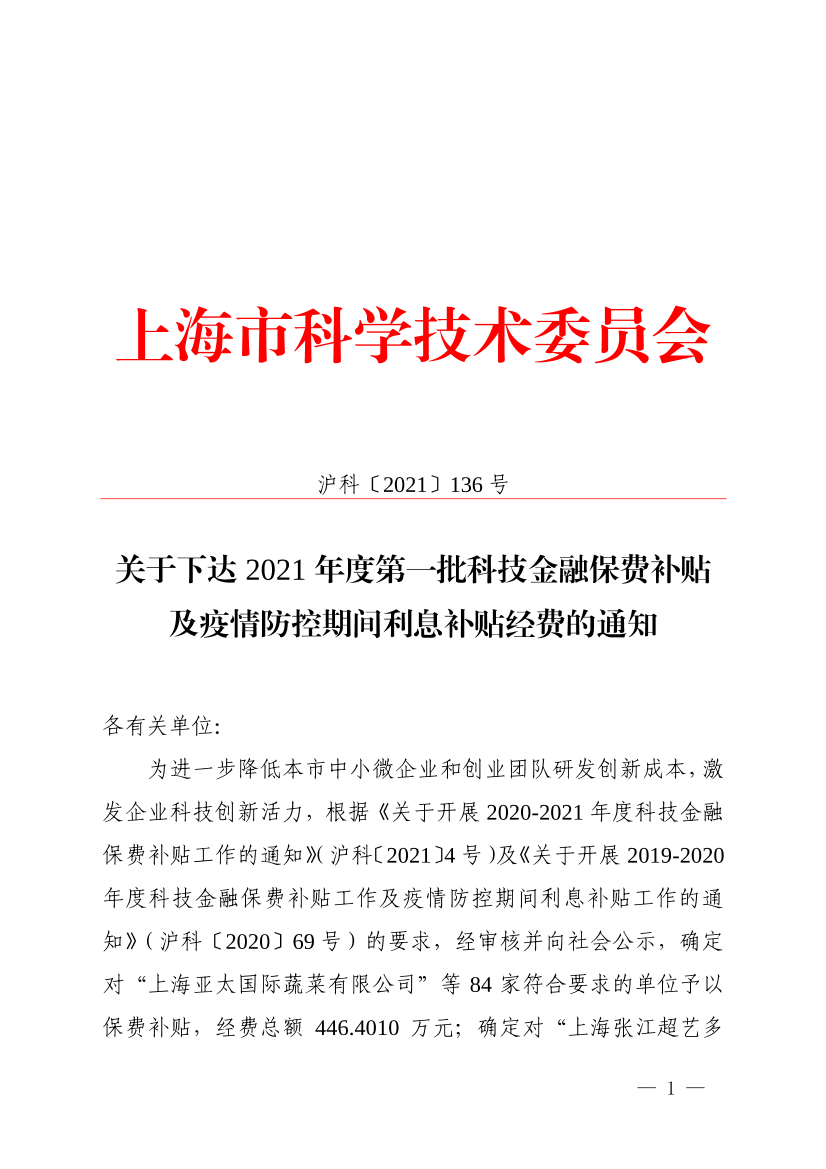 为进一步降低本市中小微企业和创业团队研发创新成本,激发企业科技创新活力,根据《关于开展2020-2021年度科技金融保费补贴工作的通知》(沪科〔2021〕4号)及《关于开展2019-2020年度科技金融保费补贴工作及疫情防控期间利息补贴工作的通知》(沪科〔2020〕69号)的要求,经审核并向社会公示,确定对“上海亚太国际蔬菜有限公司”等84家符合要求的单位予以保费补贴,经费总额446.4010万元;确定对“上海张江超艺多媒体系统股份有限公司”等115家符合要求的单位予以利息补贴,经费总额221.2633万元。