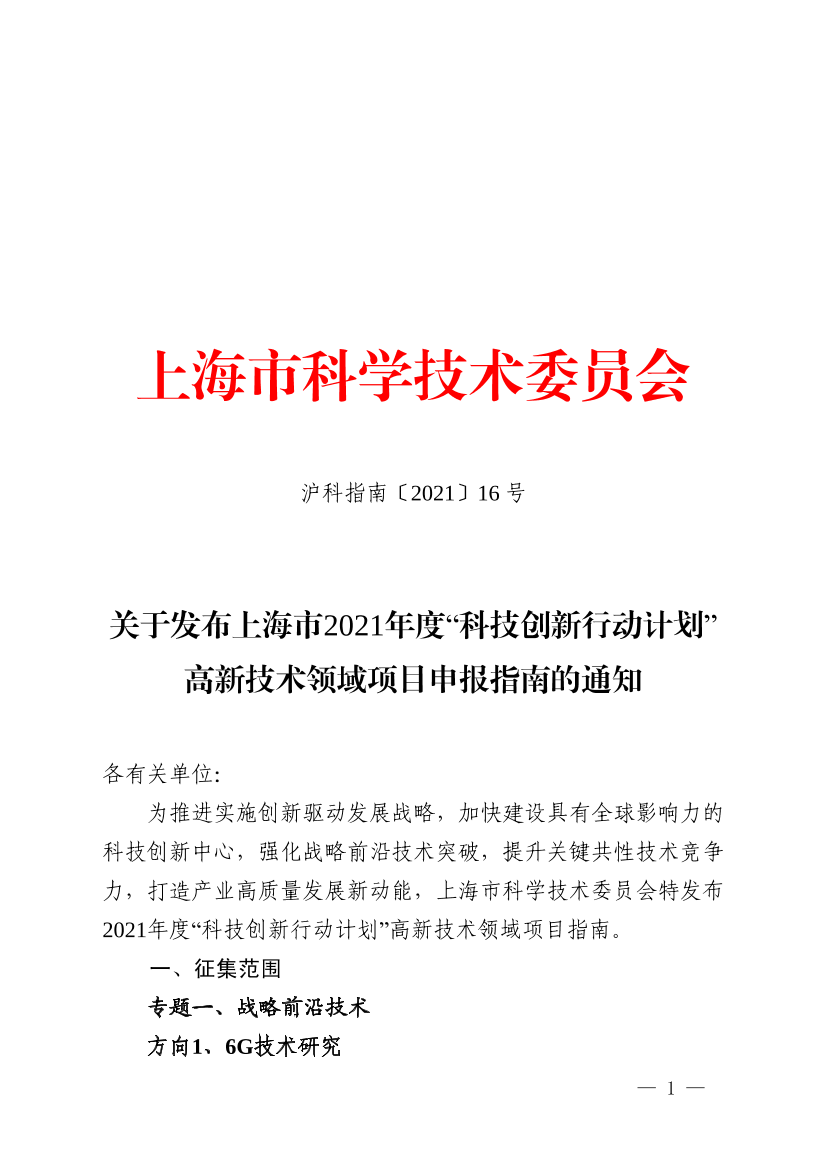 为推进实施创新驱动发展战略,加快建设具有全球影响力的科技创新中心,强化战略前沿技术突破,提升关键共性技术竞争力,打造产业高质量发展新动能,上海市科学技术委员会特发布2021年度“科技创新行动计划”高新技术领域项目指南。