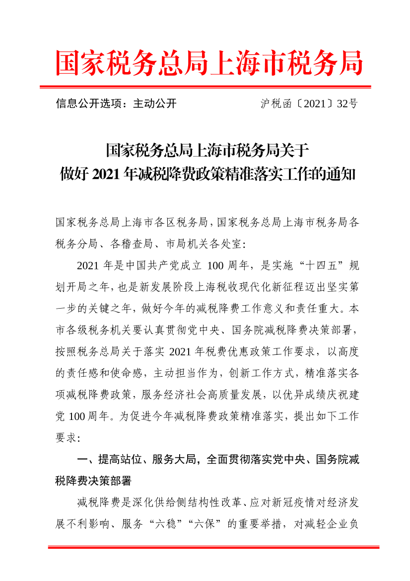 2021年是中国共产党成立100周年,是实施“十四五”规划开局之年,也是新发展阶段上海税收现代化新征程迈出坚实第一步的关键之年,做好今年的减税降费工作意义和责任重大。本市各级税务机关要认真贯彻党中央、国务院减税降费决策部署,按照税务总局关于落实2021年税费优惠政策工作要求,以高度的责任感和使命感,主动担当作为,创新工作方式,精准落实各项减税降费政策,服务经济社会高质量发展,以优异成绩庆祝建党100周年。为促进今年减税降费政策精准落实,提出如下工作要求: