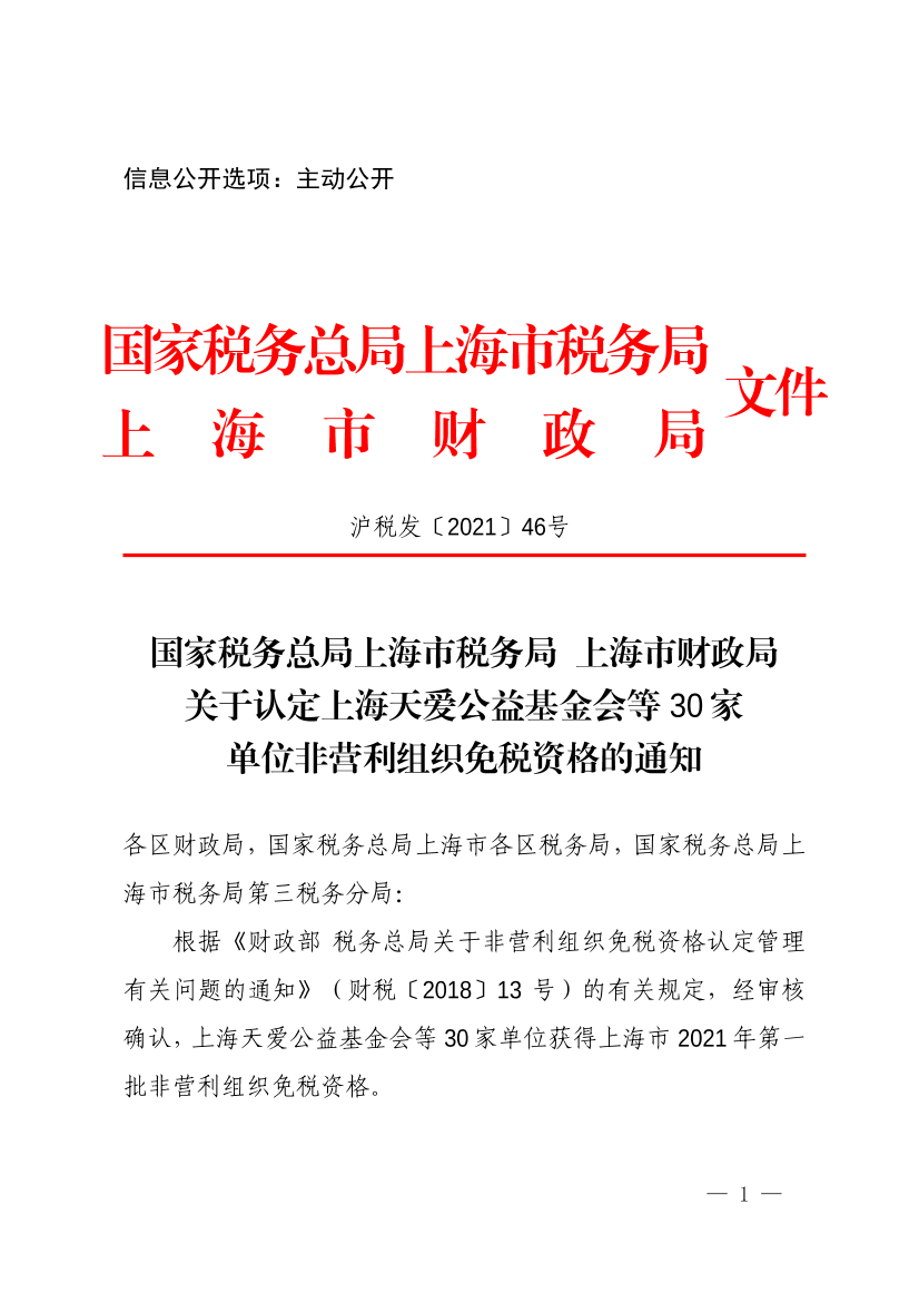 根据《财政部 税务总局关于非营利组织免税资格认定管理有关问题的通知》(财税〔2018〕13号)的有关规定,经审核确认,上海天爱公益基金会等30家单位获得上海市2021年第一批非营利组织免税资格。