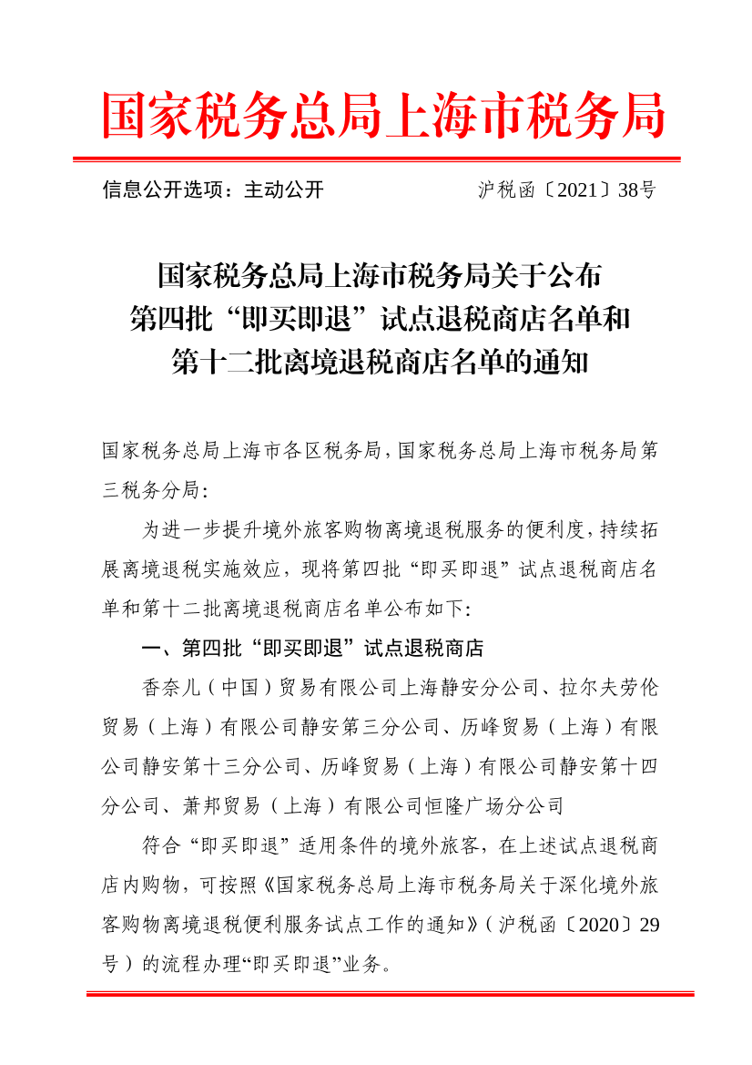 为进一步提升境外旅客购物离境退税服务的便利度,持续拓展离境退税实施效应,现将第四批“即买即退”试点退税商店名单和第十二批离境退税商店名单公布如下: