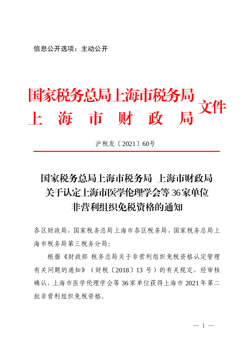 根据《财政部 税务总局关于非营利组织免税资格认定管理有关问题的通知》(财税〔2018〕13号)的有关规定,经审核确认,上海市医学伦理学会等36家单位获得上海市2021年第二批非营利组织免税资格。