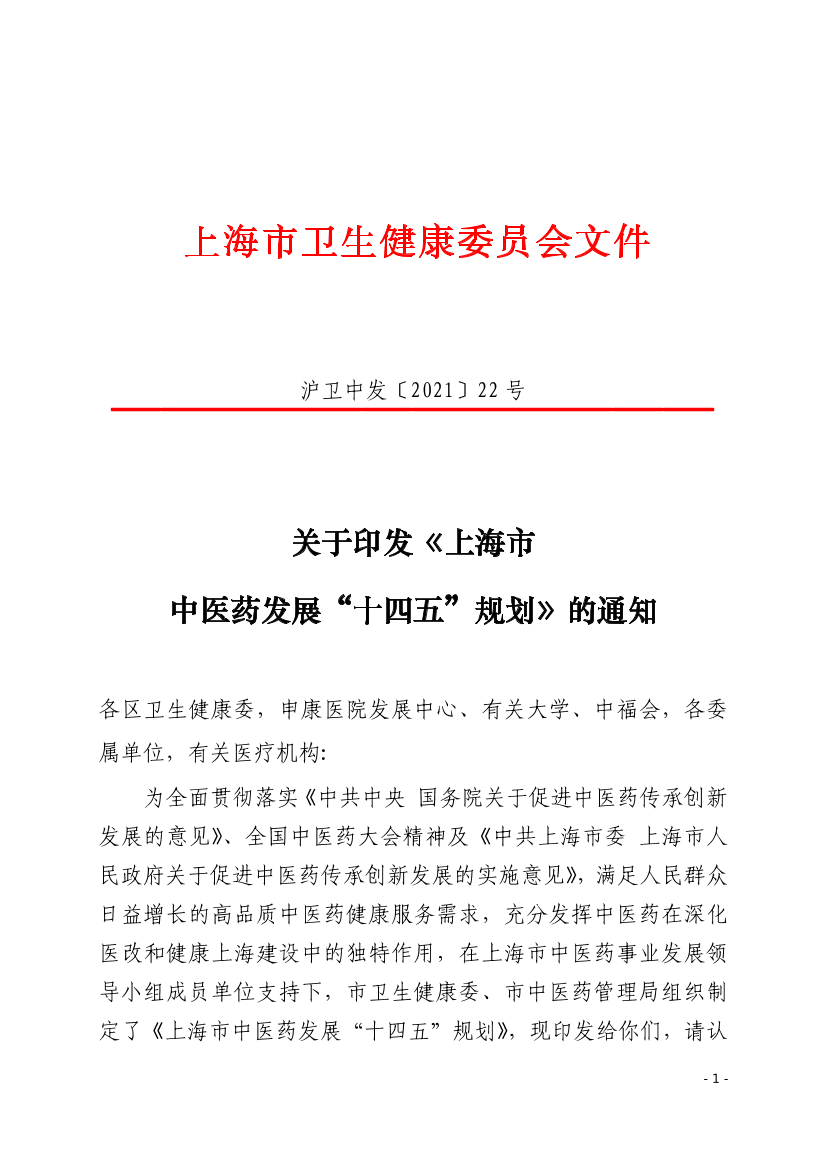 为全面贯彻落实《中共中央 国务院关于促进中医药传承创新发展的意见》、全国中医药大会精神及《中共上海市委 上海市人民政府关于促进中医药传承创新发展的实施意见》,满足人民群众日益增长的高品质中医药健康服务需求,充分发挥中医药在深化医改和健康上海建设中的独特作用,在上海市中医药事业发展领导小组成员单位支持下,市卫生健康委、市中医药管理局组织制定了《上海市中医药发展“十四五”规划》,现印发给你们,请认真组织实施。