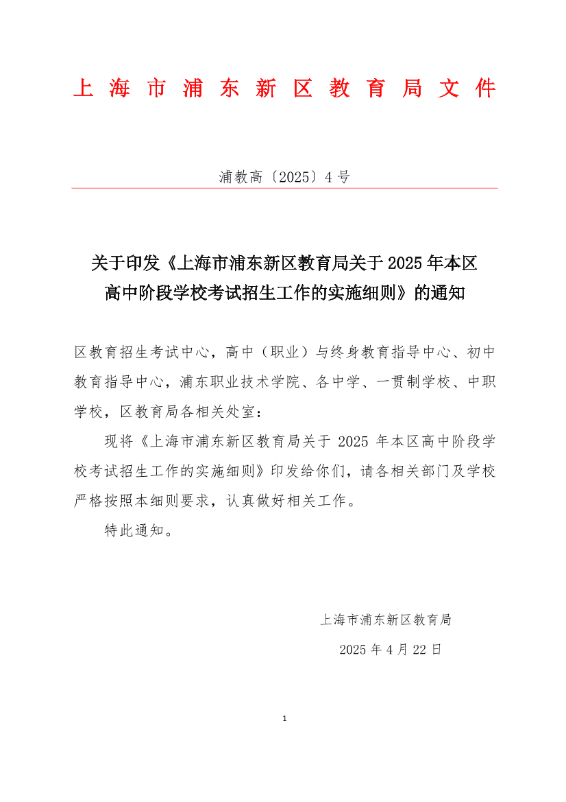 上海市浦东新区教育局关于2025年本区高中阶段学校考试招生工作的实施细则