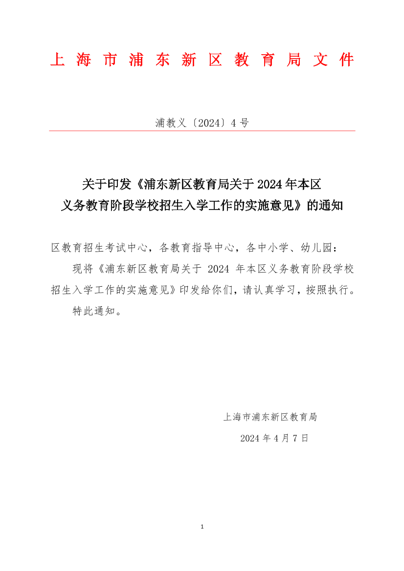 浦东新区教育局关于2024年本区义务教育阶段学校招生入学工作的实施意见
