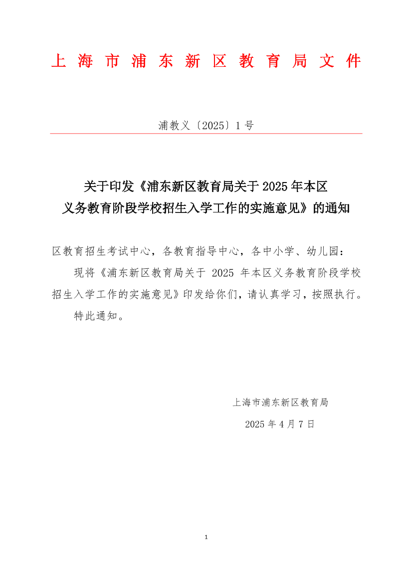 浦东新区教育局关于2025年本区义务教育阶段学校招生入学工作的实施意见