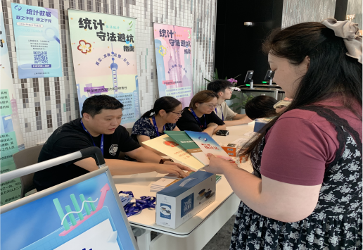 为“零距离”向社会公众宣传普及统计知识,促进公众了解统计、参与统计、支持统计,营造良好统计法治环境。8月27日上午,区统计局联合桃浦镇在智创TOP园区圆满举办“2024年普陀区政府开放月暨统计开放日活动”,扩大统计普法宣传的影响力。本次统计开放日的主题是“统计数据取之于民、用之于民”,活动现场设置统计宣传服务台,通过发放宣传资料、“法律法规100问”、“图解统计法”等宣传手册以及现场咨询等方式,宣传统计相关法律法规知识,活动现场吸引200余人次积极参与。通过本次活动,搭建了统计与社会公众互动交流的桥梁,让统计知识和统计法律法规深入人心,让更多群众对统计工作有了更加直观的感受和更为深刻的认识,让更多企业员工、群众了解统计、知晓统计、参与统计,进一步促进了社会各界对统计工作和统计数据的认知和理解,提高了对统计工作的支持和配合。