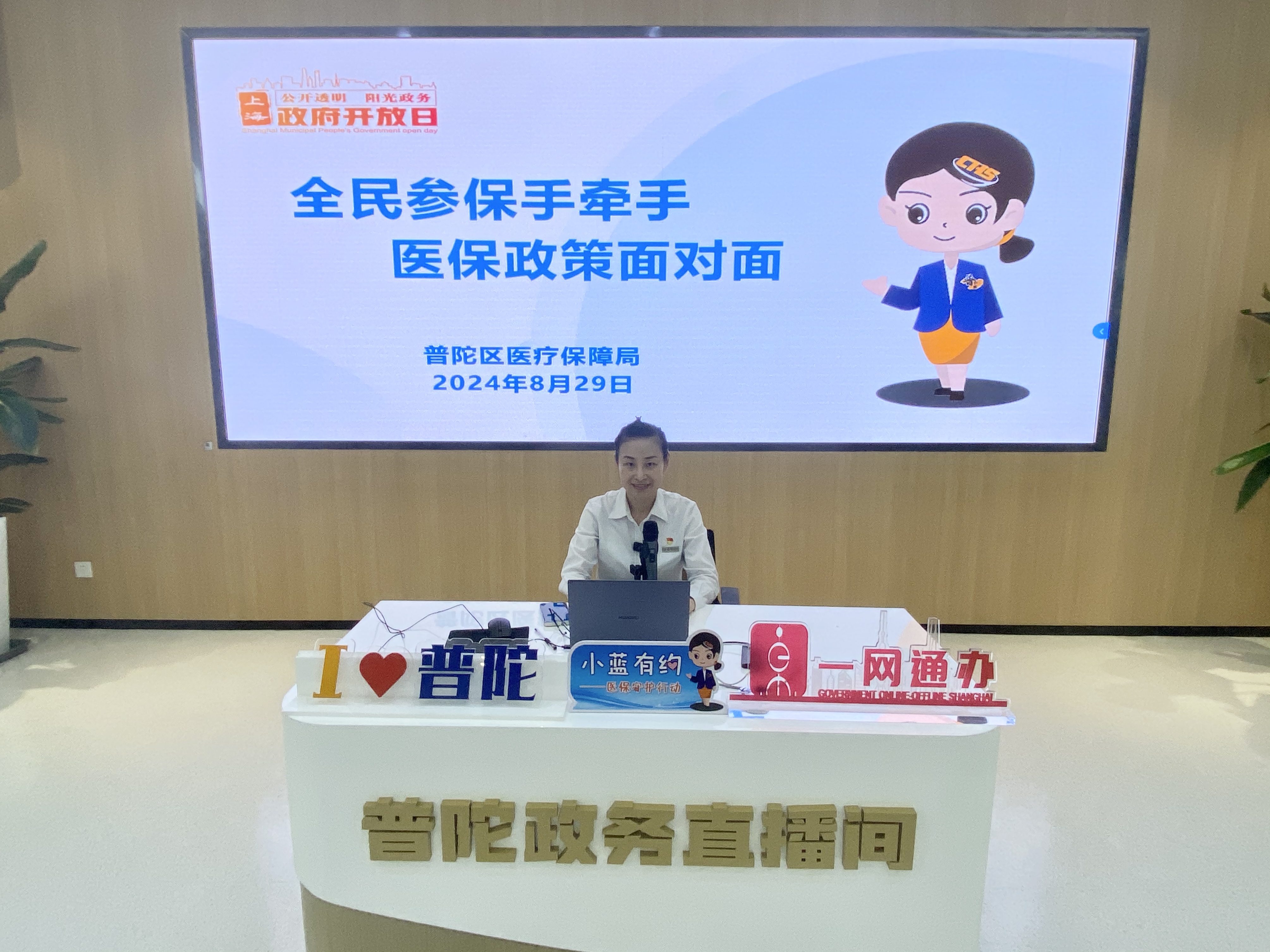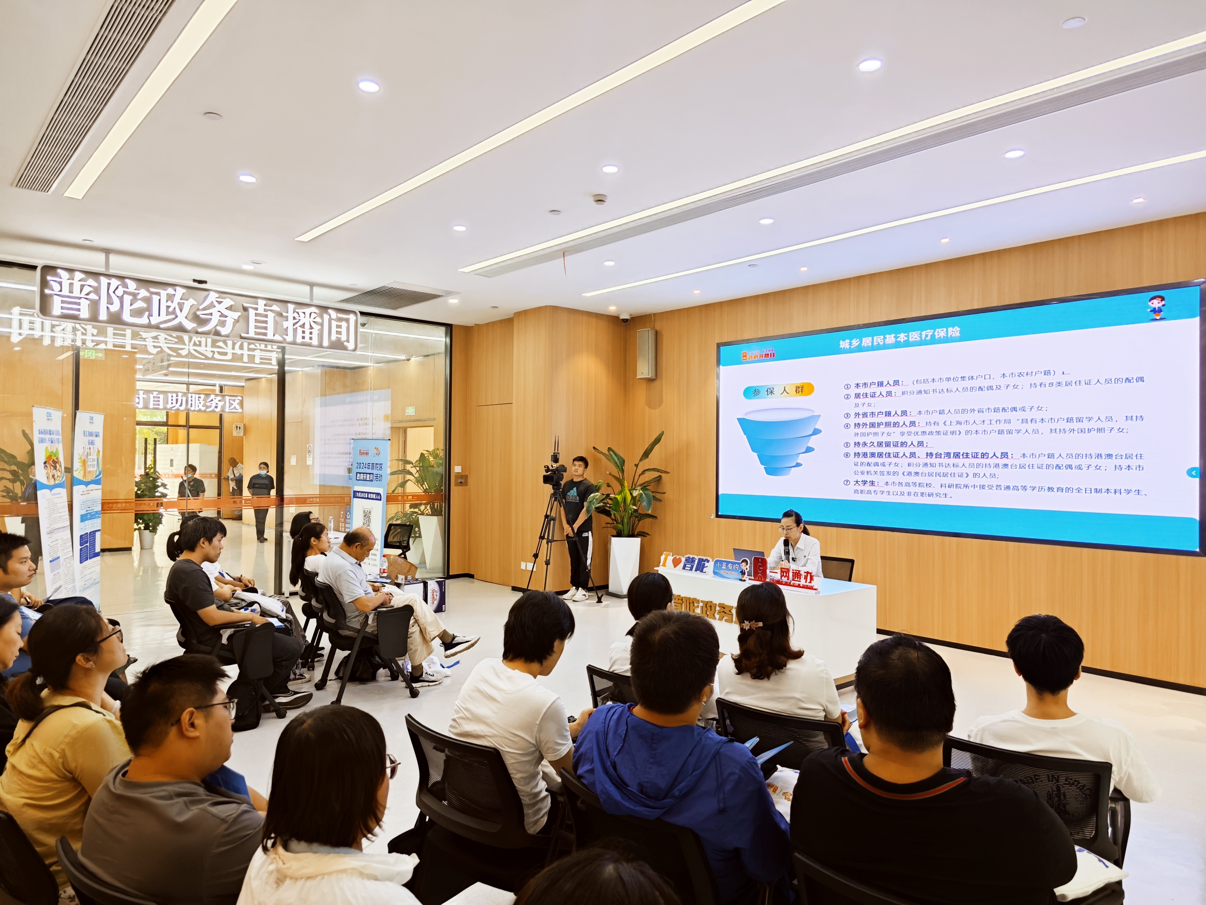 为深入推进本市基本医保全民参保工作,积极顺应数字化时代医保经办服务模式优化创新发展要求,更多元化地宣介医保惠民政策,8月29日下午,区医保局组织开展了“全民参保手牵手,医保政策面对面”——2024年普陀区政府开放月医保专场活动,以“政务直播”的形式,邀请市民代表、街道、镇社区事务受理服务中心工作人员、居委干部等30余人参加现场活动,线上260名社区居民观看了直播。