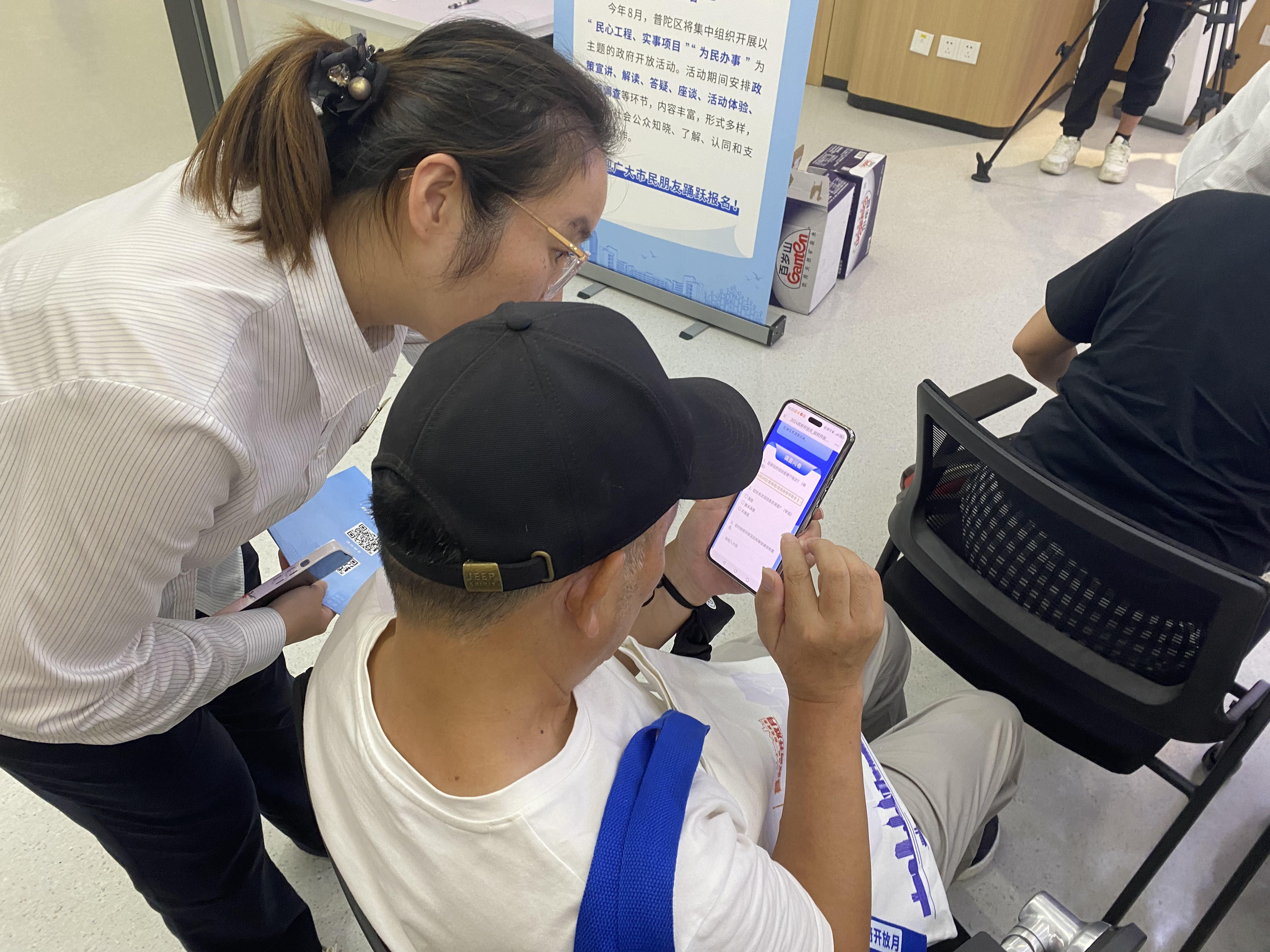 互动环节,区医保中心工作人员引导现场公众代表扫描“普陀医保服务码”,参与在线模拟操作,沉浸式感受在线办理医保业务的便捷流程,并就公众代表们提出的家庭共济、生育保险等方面政策问题进行现场交流与解答。