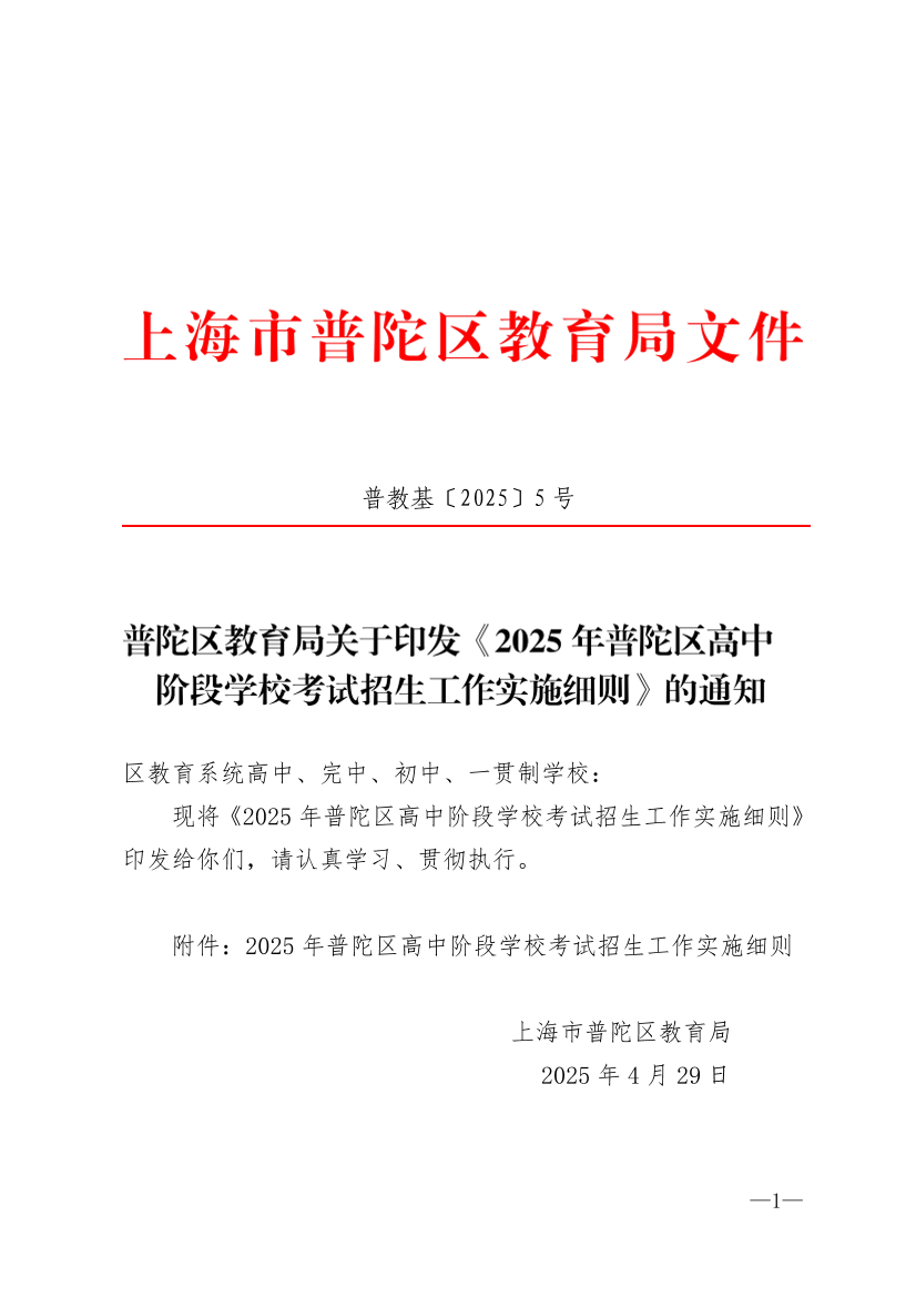 附件:2025年普陀区高中阶段学校考试招生工作实施细则