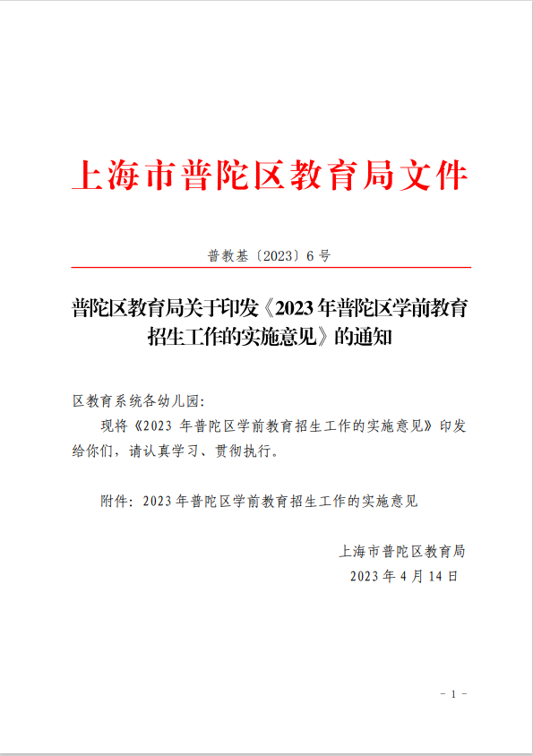 公布《2023年普陀区学前教育招生工作实施意见》 |
