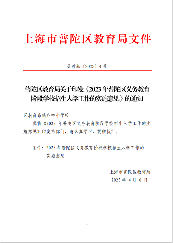 附件:2023年普陀区义务教育阶段学校招生入学工作的实施意见