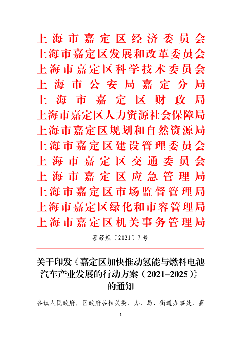 关于印发《嘉定区加快推动氢能与燃料电池汽车产业发展的行动方案(2021-2025)》的通知