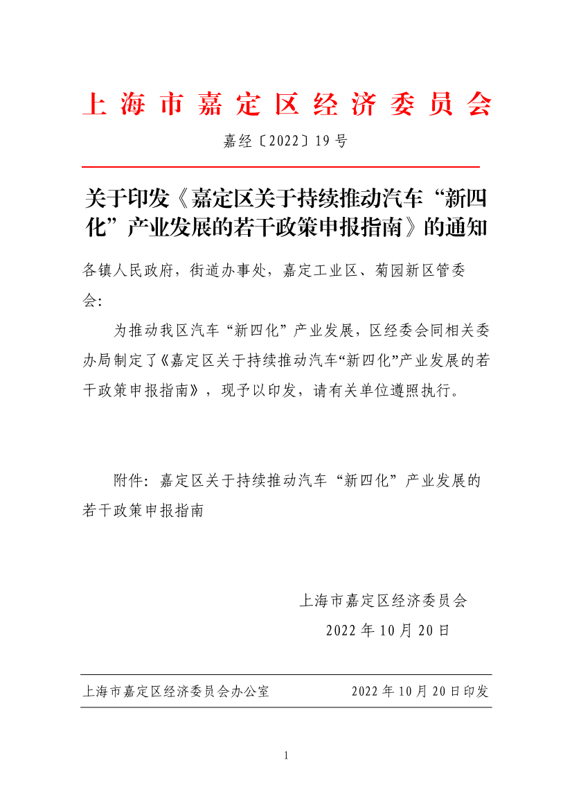 关于印发《嘉定区关于持续推动汽车“新四化”产业发展的若干政策申报指南》的通知