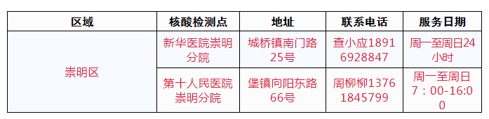 为确保生活物资保供企业、外卖平台等正常运营,保供人员和外卖骑手等正常上岗,崇明区开设了专门核酸检测点和联系方式,电商平台等保供企业可以为“骑手”等预约,保供人员凭相关证明即可快速进行核酸检测,相关信息如下。