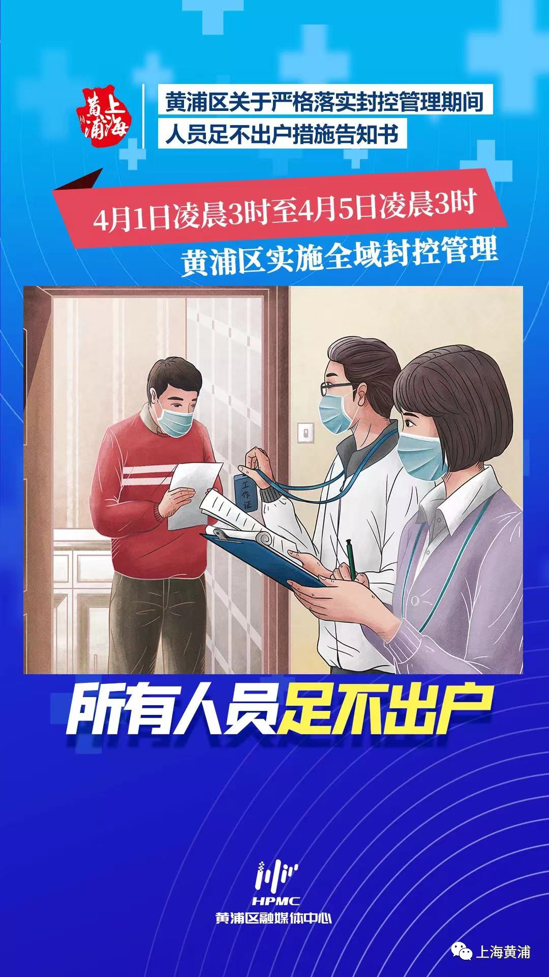 亲爱的市民朋友们,按照上海市新冠肺炎疫情防控工作领导小组办公室关于做好全市新一轮核酸筛查工作的统一部署要求,4月1日3时至4月5日3时,黄浦区将严格实施全域封控管理,期间对全域内所有人员开展两次核酸筛查。封控期间,全区所有住宅小区实施封闭式管理,所有人员足不出户,人员和车辆只进不出。