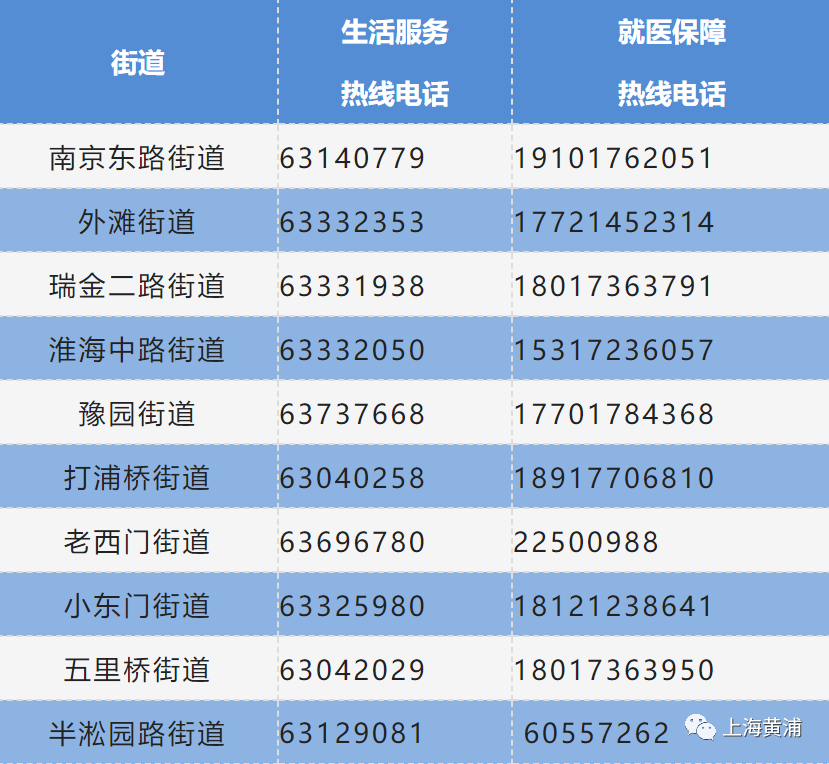 为全力做好疫情防控工作,有效减少人员聚集,更好满足疫情期间居家生活和就医服务需求,切实保障人民群众生命安全和身体健康,现将黄浦区疫情防控期间,各街道24小时服务热线电话如下: