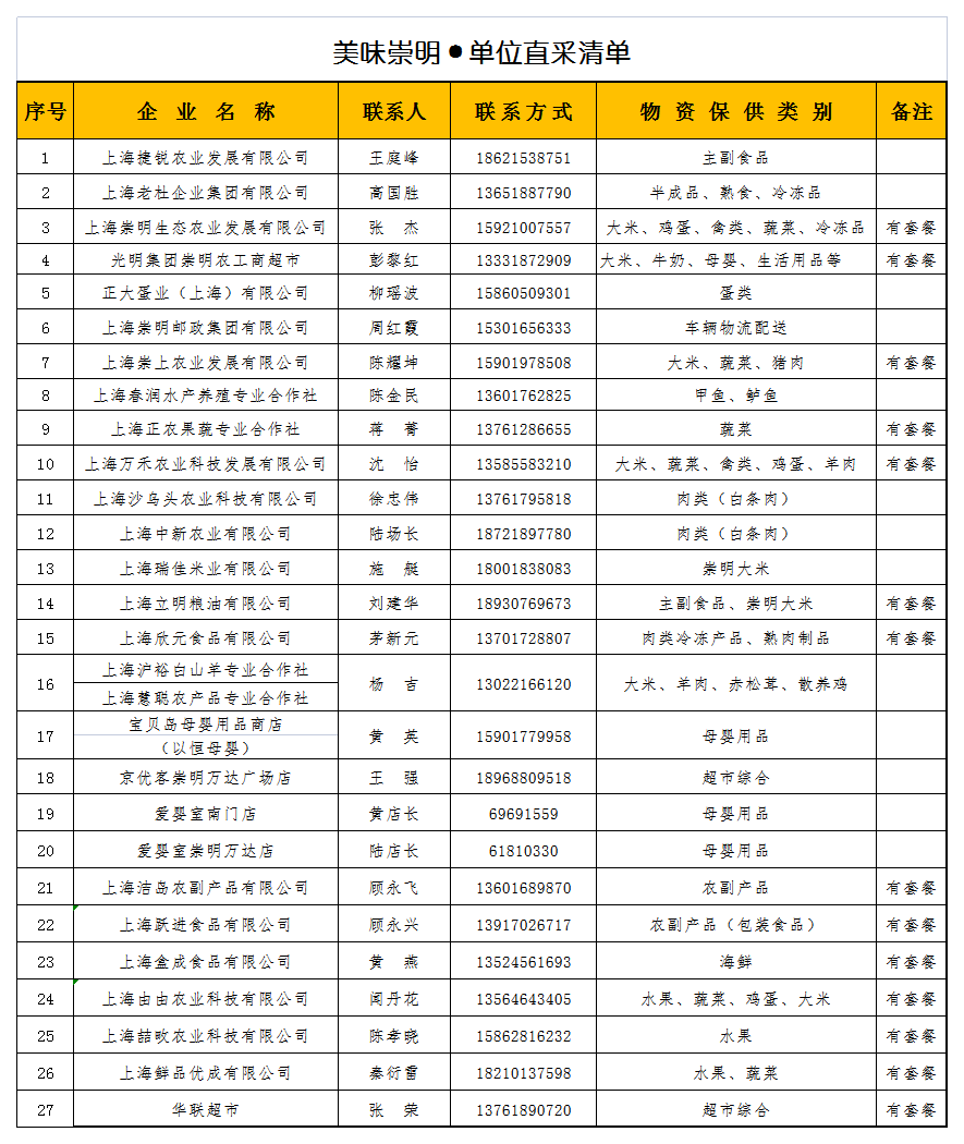 若企业等机构团体单位需要生活保障物资,可直接与相关企业联系,精准匹配供给需求,务必做到“点对点”直供、线上支付、无接触配送等防疫要求。具体企业名单如下: