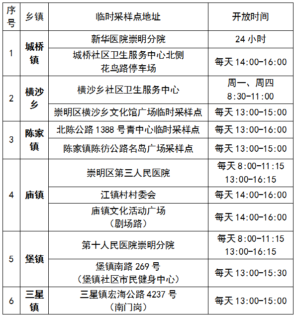 崇明区各乡镇临时采样点信息汇总,4月13日起免费提供核酸采样检测服务 2022-04-13 来源:崇明区人民政府