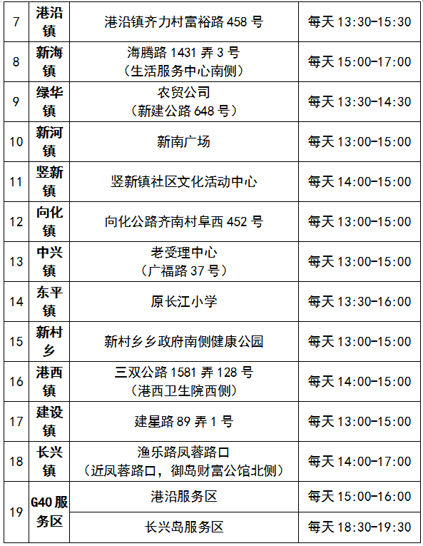 为服务各类城市运行保障等重点人群的每日核酸检测工作,方便群众主动开展核酸检测,从4月13日开始,全区各乡镇设立临时采样点,免费提供核酸采样检测服务,现公布如下: