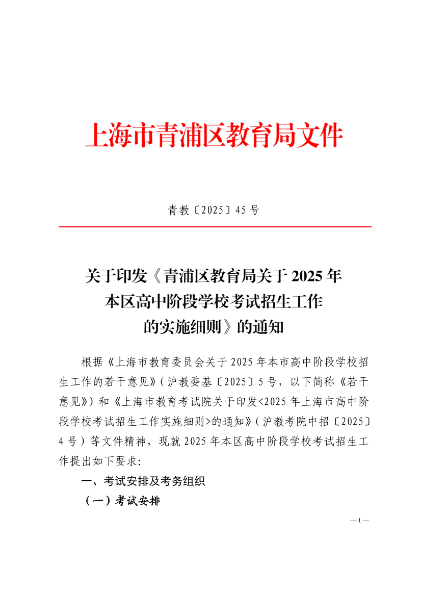 根据《上海市教育委员会关于2025年本市高中阶段学校招生工作的若干意见》(沪教委基〔2025〕5号,以下简称《若干意见》)和《上海市教育考试院关于印发<2025年上海市高中阶段学校考试招生工作实施细则>的通知》(沪教考院中招〔2025〕4号)等文件精神,现就2025年本区高中阶段学校考试招生工作提出如下要求: