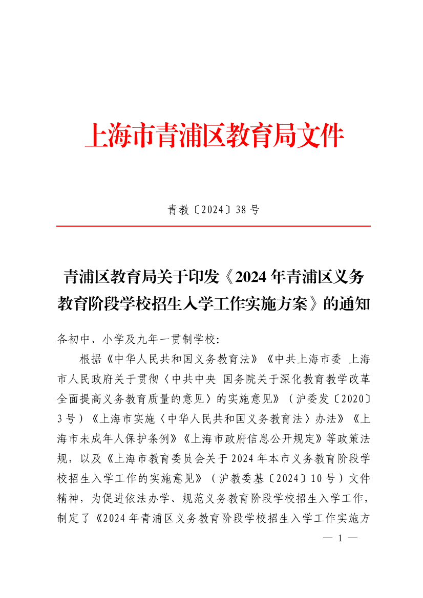 1.2024年青浦区义务教育阶段学校招生入学工作实施方案