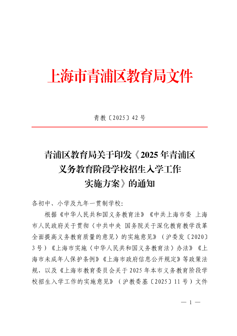 1.2025年青浦区义务教育阶段学校招生入学工作实施方案