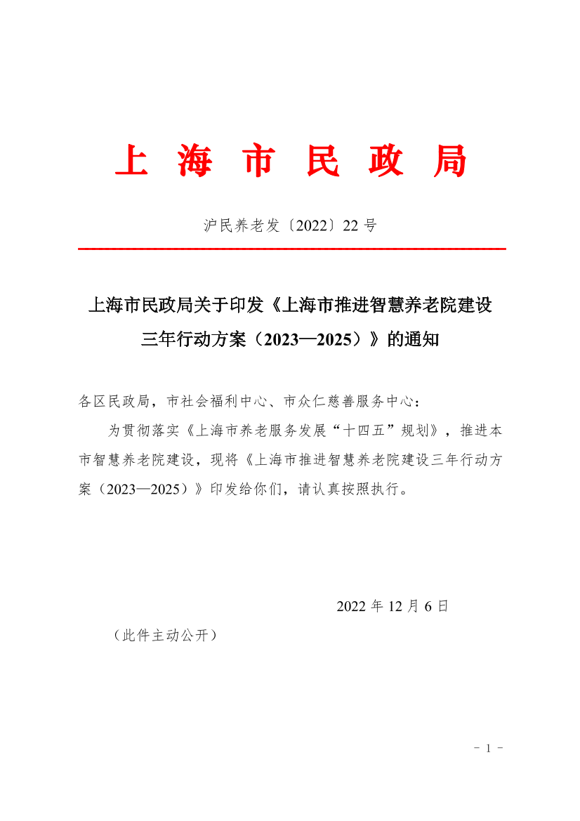 为贯彻落实《上海市养老服务发展“十四五”规划》,推进本市智慧养老院建设,现将《上海市推进智慧养老院建设三年行动方案(2023—2025)》印发给你们,请认真按照执行。