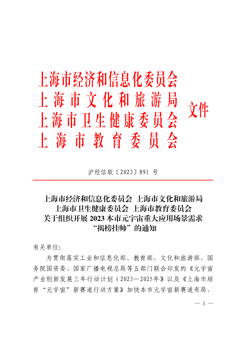 为贯彻落实工业和信息化部、教育部、文化和旅游部、国务院国资委、国家广播电视总局等五部门联合印发的《元宇宙产业创新发展三年行动计划(2023—2025年)》以及《上海市培育“元宇宙”新赛道行动方案》,加快本市元宇宙新赛道布局,培育发展新动能,推动更多应用场景落地,牵引带动元宇宙相关产业高质量发展,市经济信息化委、市文化旅游局、市卫生健康委、市教委拟联合开展2023年本市元宇宙重大应用场景需求“揭榜挂帅”工作。通知如下:
