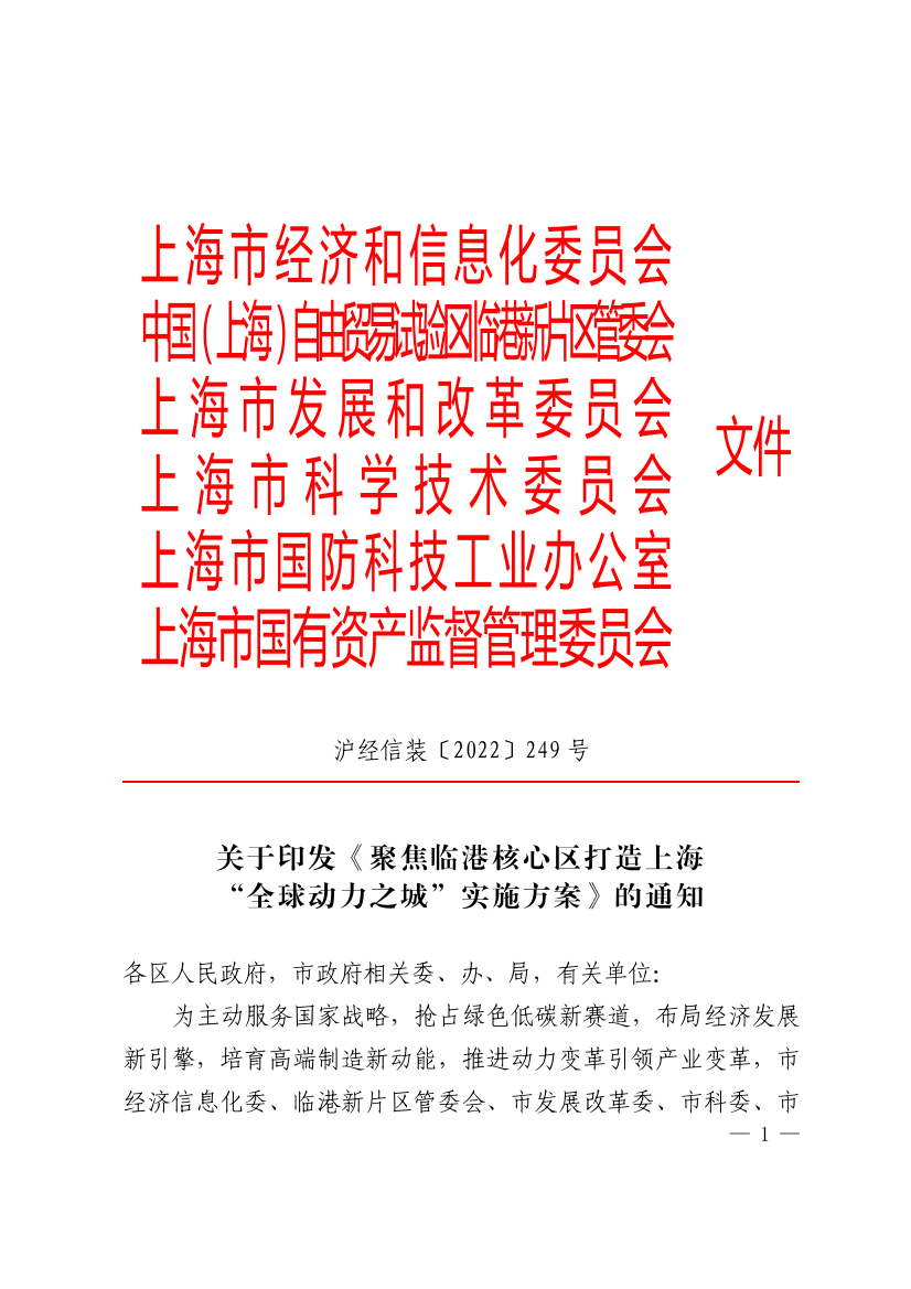 为主动服务国家战略,抢占绿色低碳新赛道,布局经济发展新引擎,培育高端制造新动能,推进动力变革引领产业变革,市经济信息化委、临港新片区管委会、市发展改革委、市科委、市国防科工办、市国资委联合制定了《聚焦临港核心区打造上海“全球动力之城”实施方案》。经市政府同意,现印发给你们,请认真贯彻执行。