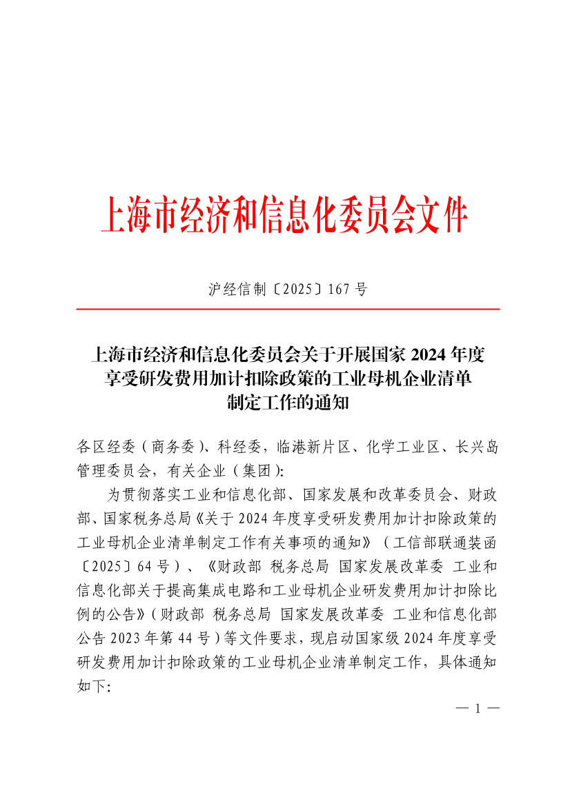 为贯彻落实工业和信息化部、国家发展和改革委员会、财政部、国家税务总局《关于2024年度享受研发费用加计扣除政策的工业母机企业清单制定工作有关事项的通知》(工信部联通装函〔2025〕64号)、《财政部 税务总局 国家发展改革委 工业和信息化部关于提高集成电路和工业母机企业研发费用加计扣除比例的公告》(财政部 税务总局 国家发展改革委 工业和信息化部公告2023年第44号)等文件要求,现启动国家级2024年度享受研发费用加计扣除政策的工业母机企业清单制定工作,具体通知如下:
