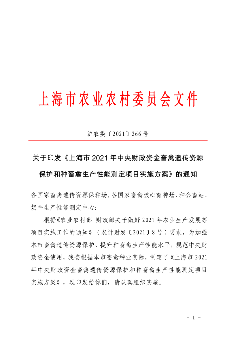 根据《农业农村部 财政部关于做好2021年农业生产发展等项目实施工作的通知》(农计财发〔2021〕8号)要求,为加强本市畜禽遗传资源保护、提升种畜禽生产性能水平,规范中央财政资金使用,我委根据本市畜禽种业实际,制定了《上海市2021年中央财政资金畜禽遗传资源保护和种畜禽生产性能测定项目实施方案》,现印发给你们,请认真组织实施。
