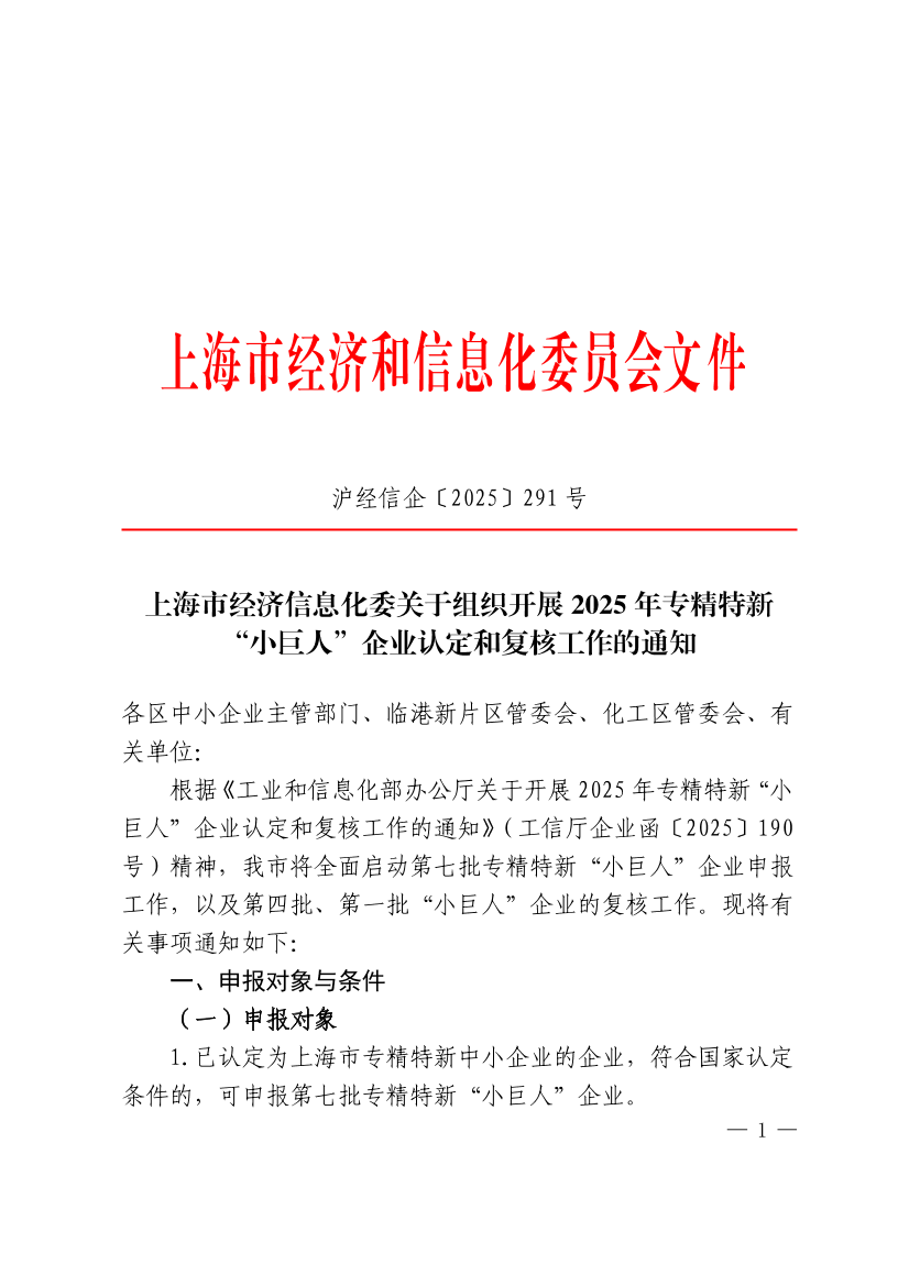 根据《工业和信息化部办公厅关于开展2025年专精特新“小巨人”企业认定和复核工作的通知》(工信厅企业函〔2025〕190号)精神,我市将全面启动第七批专精特新“小巨人”企业申报工作,以及第四批、第一批“小巨人”企业的复核工作。现将有关事项通知如下: