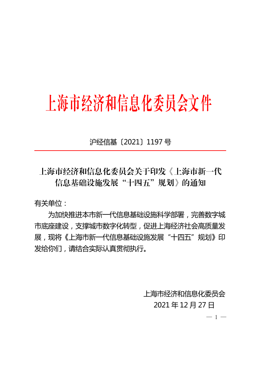 为加快推进本市新一代信息基础设施科学部署,完善数字城市底座建设,支撑城市数字化转型,促进上海经济社会高质量发展,现将《上海市新一代信息基础设施发展“十四五”规划》印发给你们,请结合实际认真贯彻执行。
