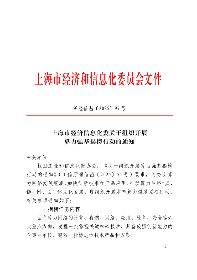 根据工业和信息化部办公厅《关于组织开展算力强基揭榜行动的通知》(工信厅通信函〔2025〕55号)要求,为夯实算力网络发展底座,加快创新技术和产品应用,推动算力网络“点、链、网、面”体系化发展,现组织开展本市算力强基揭榜行动。有关事项通知如下: