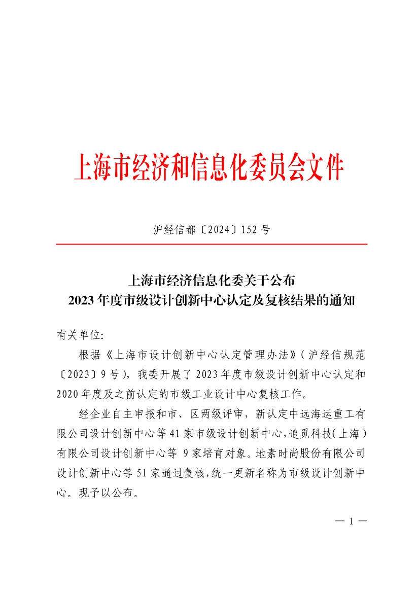 经企业自主申报和市、区两级评审,新认定中远海运重工有限公司设计创新中心等41家市级设计创新中心,追觅科技(上海)有限公司设计创新中心等 9家培育对象。地素时尚股份有限公司设计创新中心等51家通过复核,统一更新名称为市级设计创新中心。现予以公布。