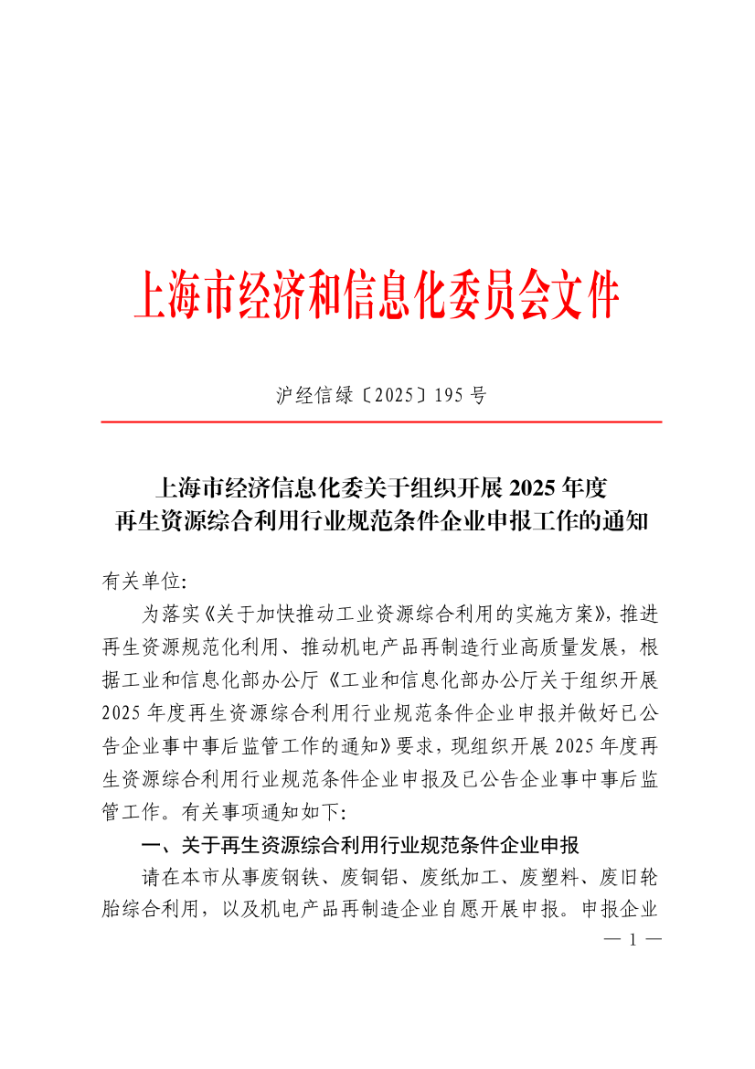 为落实《关于加快推动工业资源综合利用的实施方案》,推进再生资源规范化利用、推动机电产品再制造行业高质量发展,根据工业和信息化部办公厅《工业和信息化部办公厅关于组织开展2025年度再生资源综合利用行业规范条件企业申报并做好已公告企业事中事后监管工作的通知》要求,现组织开展2025年度再生资源综合利用行业规范条件企业申报及已公告企业事中事后监管工作。有关事项通知如下: