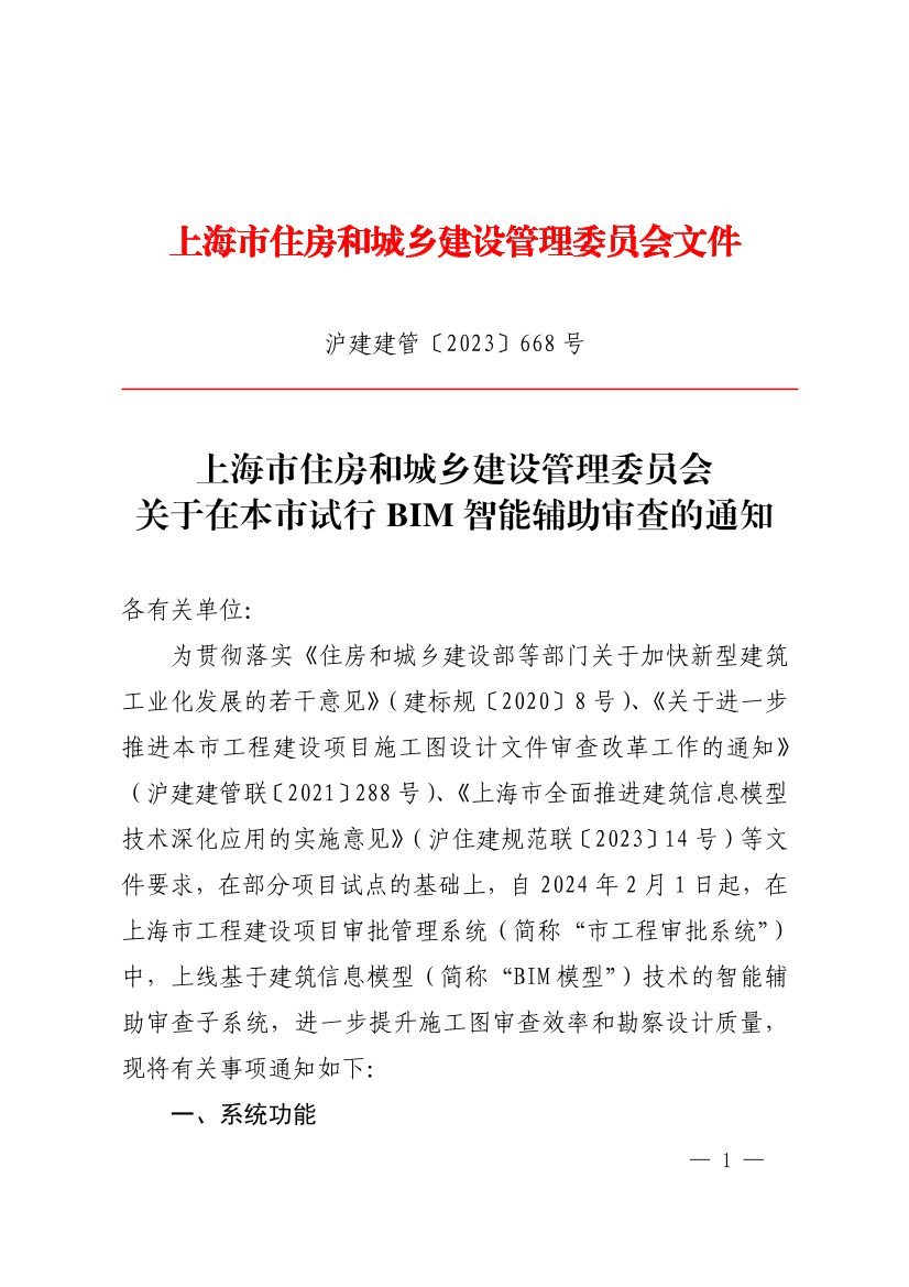 为贯彻落实《住房和城乡建设部等部门关于加快新型建筑工业化发展的若干意见》(建标规〔2020〕8号)、《关于进一步推进本市工程建设项目施工图设计文件审查改革工作的通知》(沪建建管联〔2021〕288号)、《上海市全面推进建筑信息模型技术深化应用的实施意见》(沪住建规范联〔2023〕14号)等文件要求,在部分项目试点的基础上,自2024年2月1日起,在上海市工程建设项目审批管理系统(简称“市工程审批系统”)中,上线基于建筑信息模型(简称“BIM模型”)技术的智能辅助审查子系统,进一步提升施工图审查效率和勘察设计质量,现将有关事项通知如下:
