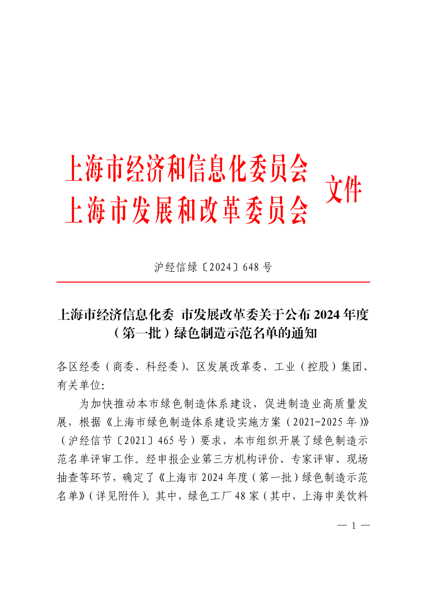 为加快推动本市绿色制造体系建设,促进制造业高质量发展,根据《上海市绿色制造体系建设实施方案(2021-2025年)》(沪经信节〔2021〕465号)要求,本市组织开展了绿色制造示范名单评审工作。经申报企业第三方机构评价、专家评审、现场抽查等环节,确定了《上海市2024年度(第一批)绿色制造示范名单》(详见附件)。其中,绿色工厂48家(其中,上海申美饮料食品有限公司、上海华谊新材料有限公司从四星级提升至五星级,包含在名单内)、绿色供应链管理企业16家(其中,上海电气集团上海电机厂有限公司从四星级提升至五星级,包含在名单内)、绿色园区2家,现予以公布。