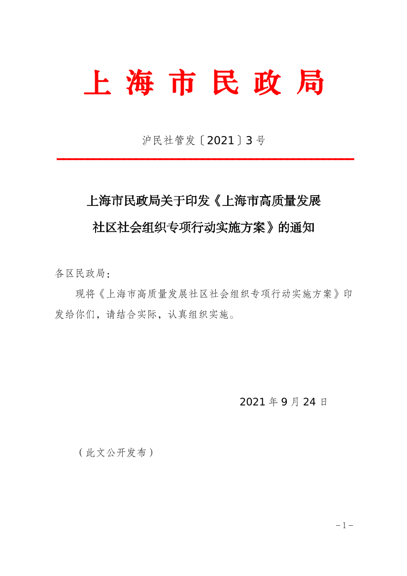 为深入学习贯彻党的十九届五中全会精神,落实民政部《培育发展社区社会组织专项行动方案(2021—2023年)》(民办发〔2020〕36号)要求,贯彻《关于高质量发展上海社区社会组织的指导意见》(沪民社管发〔2021〕2号)精神,现就实施本市高质量发展社区社会组织专项行动制定如下方案: