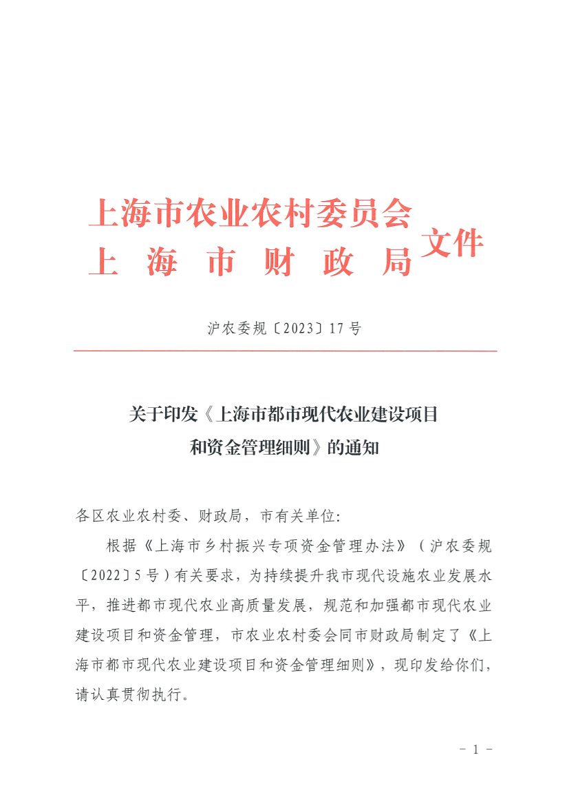 根据《上海市乡村振兴专项资金管理办法》(沪农委规〔2022〕5号)有关要求,为持续提升我市现代设施农业发展水平,推进都市现代农业高质量发展,规范和加强都市现代农业建设项目和资金管理,市农业农村委会同市财政局制定了《上海市都市现代农业建设项目和资金管理细则》,现印发给你们,请认真贯彻执行。