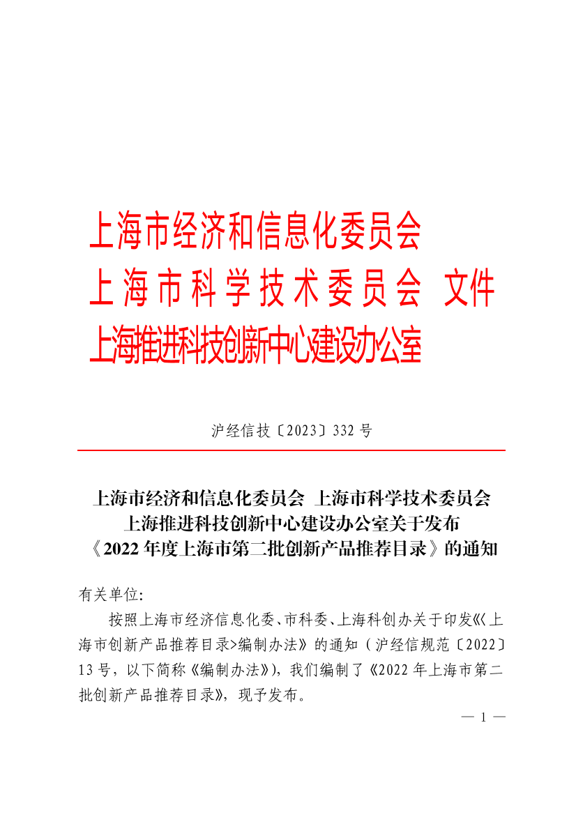 按照上海市经济信息化委、市科委、上海科创办关于印发《〈上海市创新产品推荐目录>编制办法》的通知(沪经信规范〔2022〕13号,以下简称《编制办法》),我们编制了《2022年上海市第二批创新产品推荐目录》,现予发布。